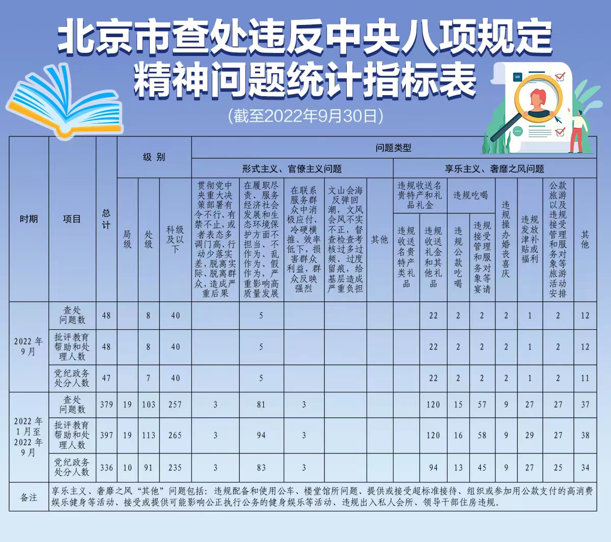 北京市查处违反中央八项规定精神问题统计指标表(截至2022年9月30日)